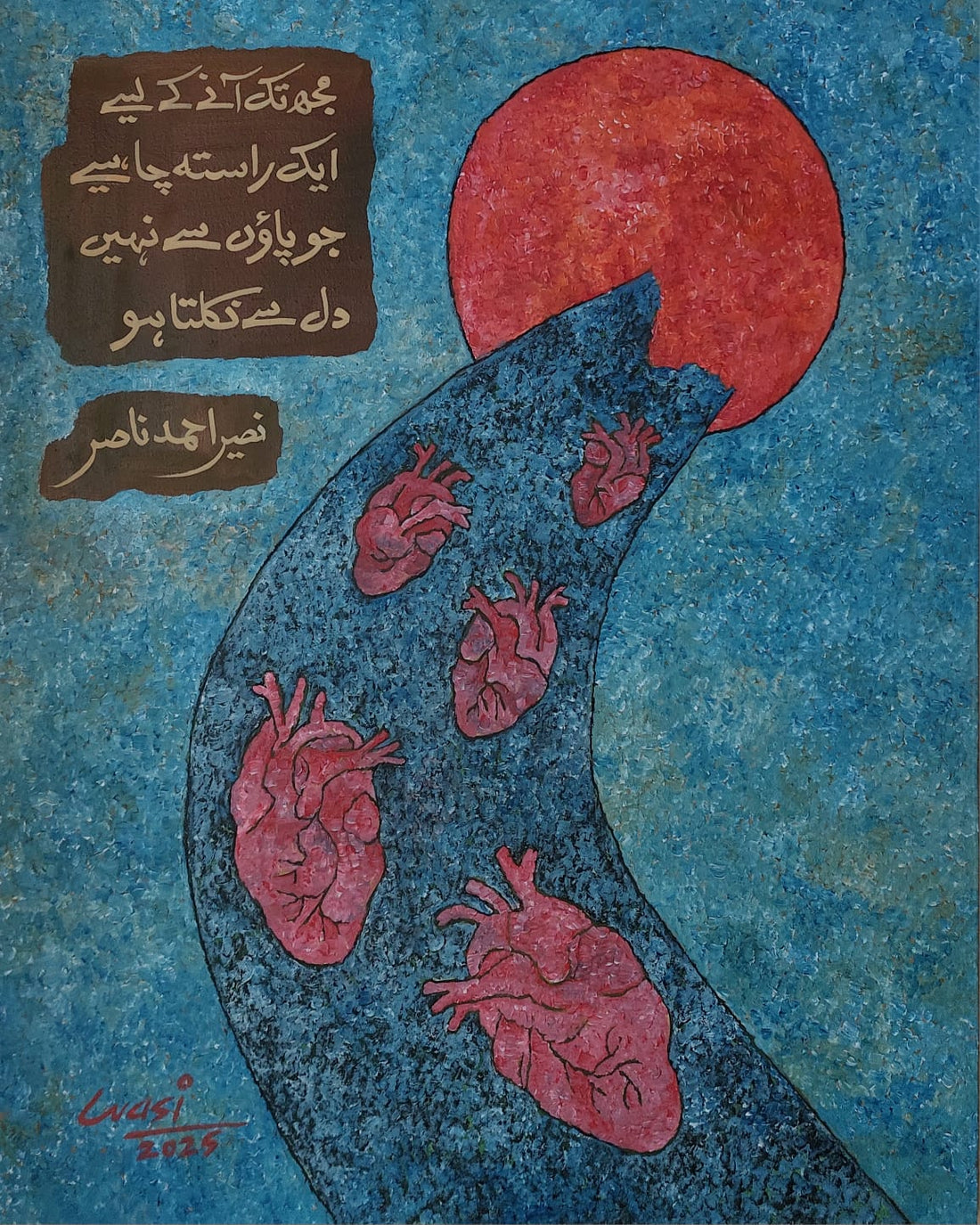 This artwork draws visual inspiration from selected poetic lines, integrating text with figurative imagery. The composition focuses on translating written expression into a visual form, where color, gesture, and symbolism respond to the emotional and conceptual essence of the verse. The inclusion of calligraphy functions not simply as text, but as a part of the overall structure, supporting the thematic direction of the artwork. Through material, form, and language, the painting explores how poetry can be experienced visually rather than solely through words.