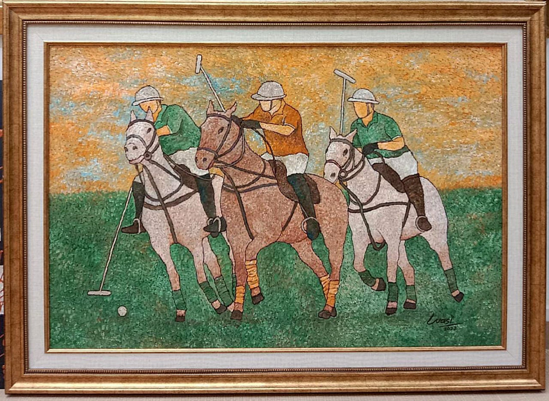 This painting reflects the energy and rhythm Of polo, capturing the harmony Of horse and rider in motion. Through vibrant colors and dynamic cornposition, it celebrates the spirit of competition and tradition.